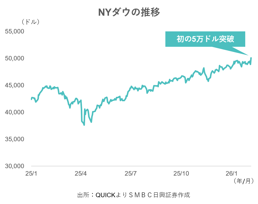 6日の米株式市場でダウ工業株30種平均は反発し、前日比1206ドル高の5万115ドルと初めて5万ドル台を付けました。米半導体大手エヌビディアのジェンスン・フアン最高経営責任者(CEO)が、AI需要は「驚くほど強い」と発言したことなどから前日比+7%超の上昇となったほか、建機大手のキャタピラーも7%超と物色の広がりが見られました。