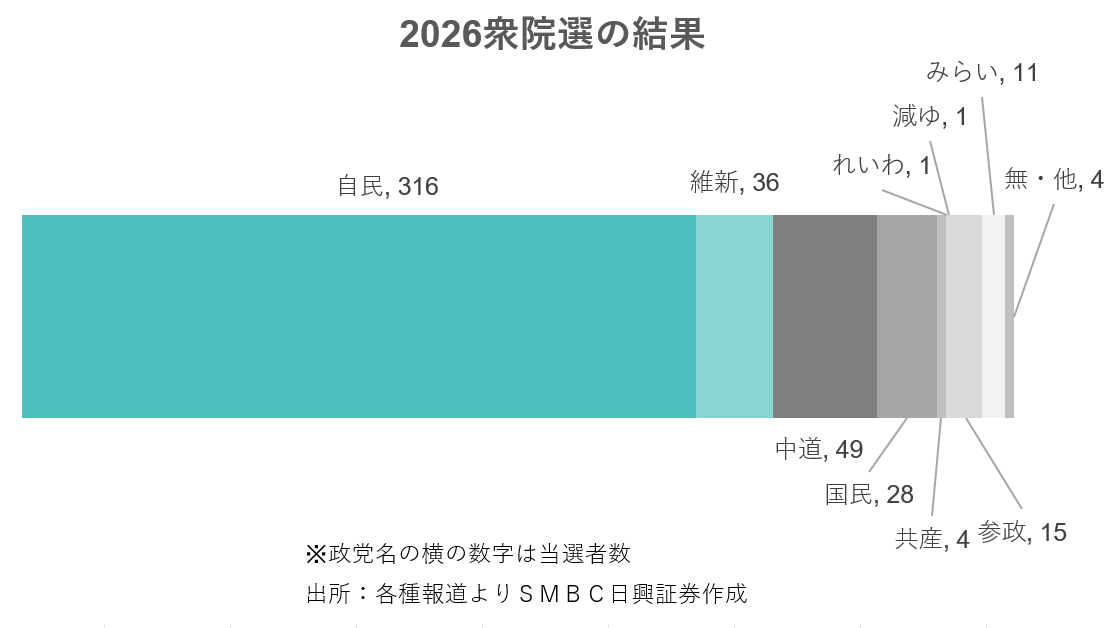 2月9日の日本株市場でもその流れを受けて買いが優勢となっています。また、8日の衆院選では、自民党が316議席を確保し、単独で定数の3分の2を上回りました。圧勝とも言える結果に、しばらくは安定的な政権運営が期待できるとの見方から、さらに投資家に買い安心感が広がっているものと見られます。