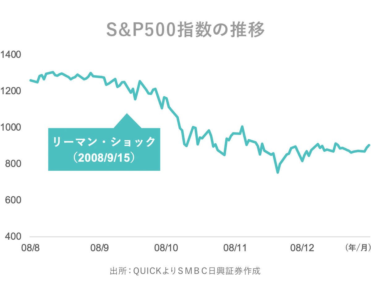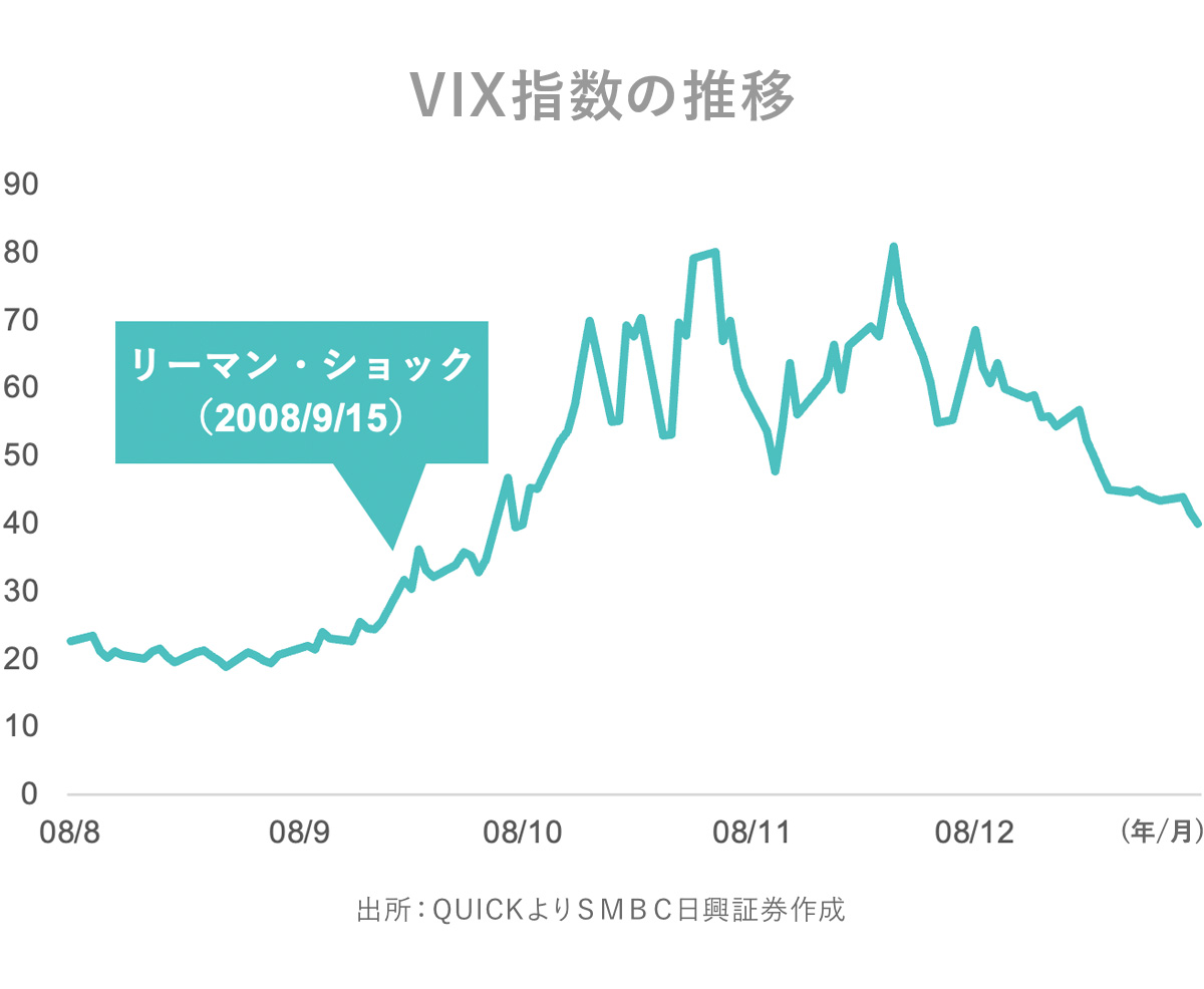 過去の例で確認しましょう。こちらのチャートは2008年8月から12月末までのVIX指数の推移です。2008/9/15に30を超え、12月末までに80を2回超えました。2008/9/15に起きたのは忘れもしないリーマン・ショックです。アメリカの大手投資銀行リーマン・ブラザーズ・ホールディングスが連邦破産法第11章(Chapter11と呼ばれる)の適用を申請し、経営破綻した日です。その後の世界金融危機の引き金になった日とも言えます。以降、世界の金融市場では信用収縮が起き、世界中で株安が起きました。