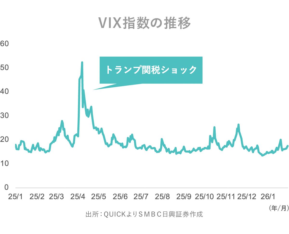 もう一つは「逆張りのシグナル」として使うことです。40を超えるような水準はいったん底をつけることが少なくなく、振り返ると買い場だったことがしばしばあるからです。直近で40を超えたのは2025年4月、いわゆる「トランプ・関税ショック」の時でした。