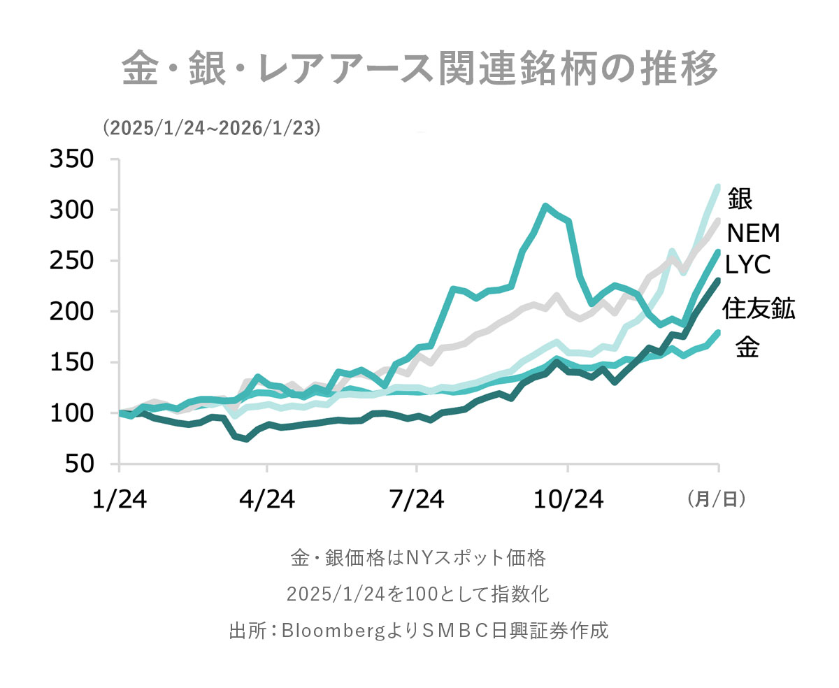 金や銀は伝統的に「価値保存の手段」として知られてきました。近年は価格が大きく上昇しています。2026年1月29日には、金スポット価格は一時1オンス=5500ドルを超え史上最高値を更新しました。これは、グリーンランドの領有権を巡るアメリカとNATO加盟国の対立など、世界の政治的な緊張が背景にあります。また、各国の中央銀行が金を安定的に買い続けていることも理由です。金に加え大きな存在感を放っているのが銀です。銀スポット価格は2025年後半から一段と急騰し、1月29日には一時1オンス120ドルを超え、1年で3倍を超えましたが、1月30日には金が約10%、銀が約30%ほど下がりました。銀は電気や熱伝導率が高く、半導体、電子機器など幅広い製品に使われるため、供給が不足すると産業にも大きな影響があります。こうした資源価格の高騰により、ニューモント(NEM)や「 住友金属鉱山 」など大手鉱山会社の業績拡大や株価上昇が続いています。