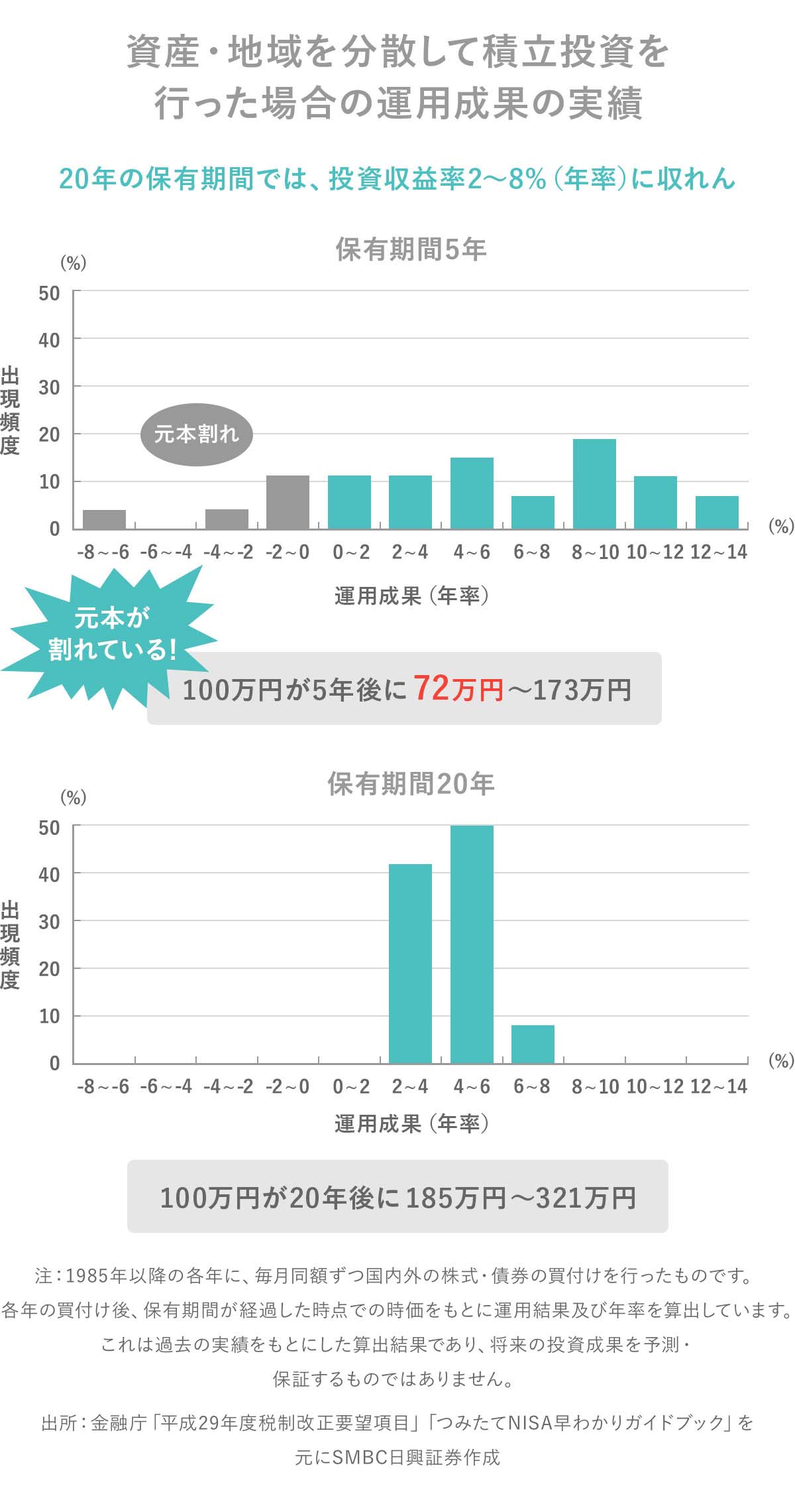 地域や資産などを分散し、長期でつみたて投資をすると、運用成果は安定しやすくなります。たとえば、運用期間が5年の場合は、元本割れから年率10%超まで結果に大きな差が出ますが、20年続けると収益率はおおむね2〜8%の範囲に収まるのです。