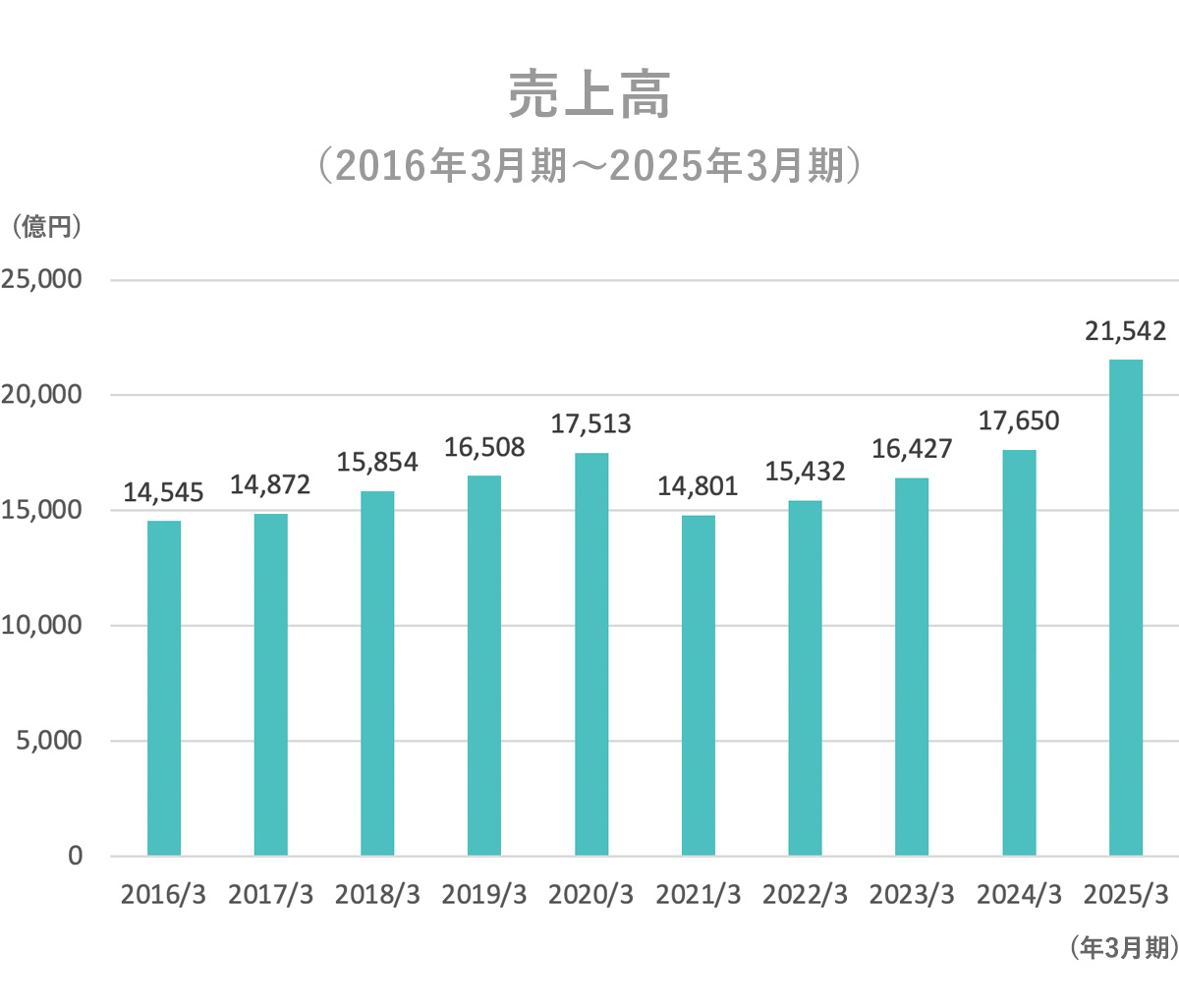 まず、売上高の推移は、2016年3月期~2020年3月期までは増収傾向で1.4兆円台~1.7兆円台まで増加しています。2021年3月期は1.4兆円台に減少しましたが、その後は増収傾向が続き、2025年3月期には2兆1542億円まで増加しています。