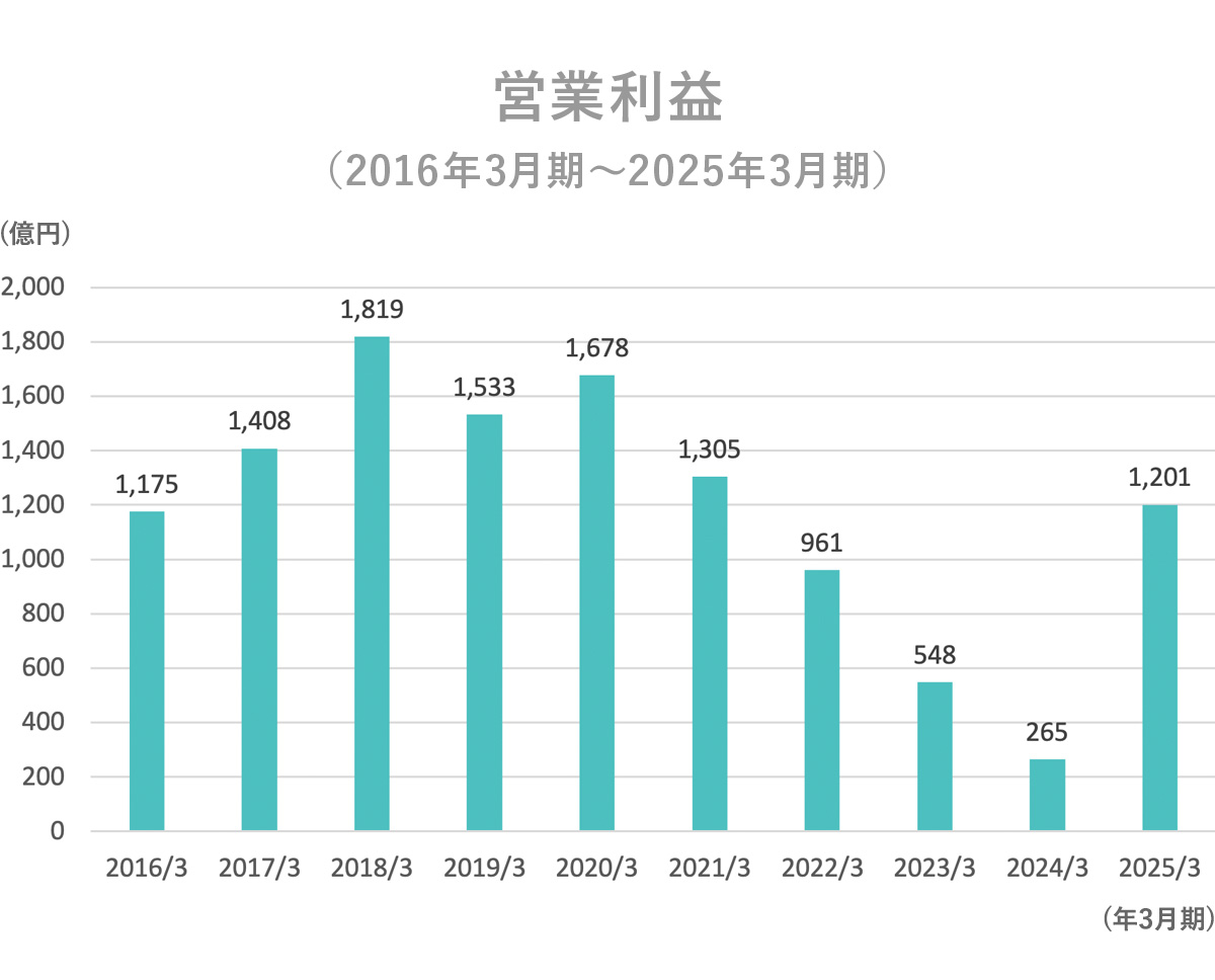 利益面の推移は、増減ありつつですが、2020年3月期までは堅調な状況が続きます。その後は2024年3月期まで減益傾向となり、利益面は苦戦していますが、2025年3月期に収益性が回復しています。営業利益に関しては、2010年代後半の利益面が好調だった時期に及ばず、収益性は以前と比べると低迷しているものの、一定の改善は進んでいます。
