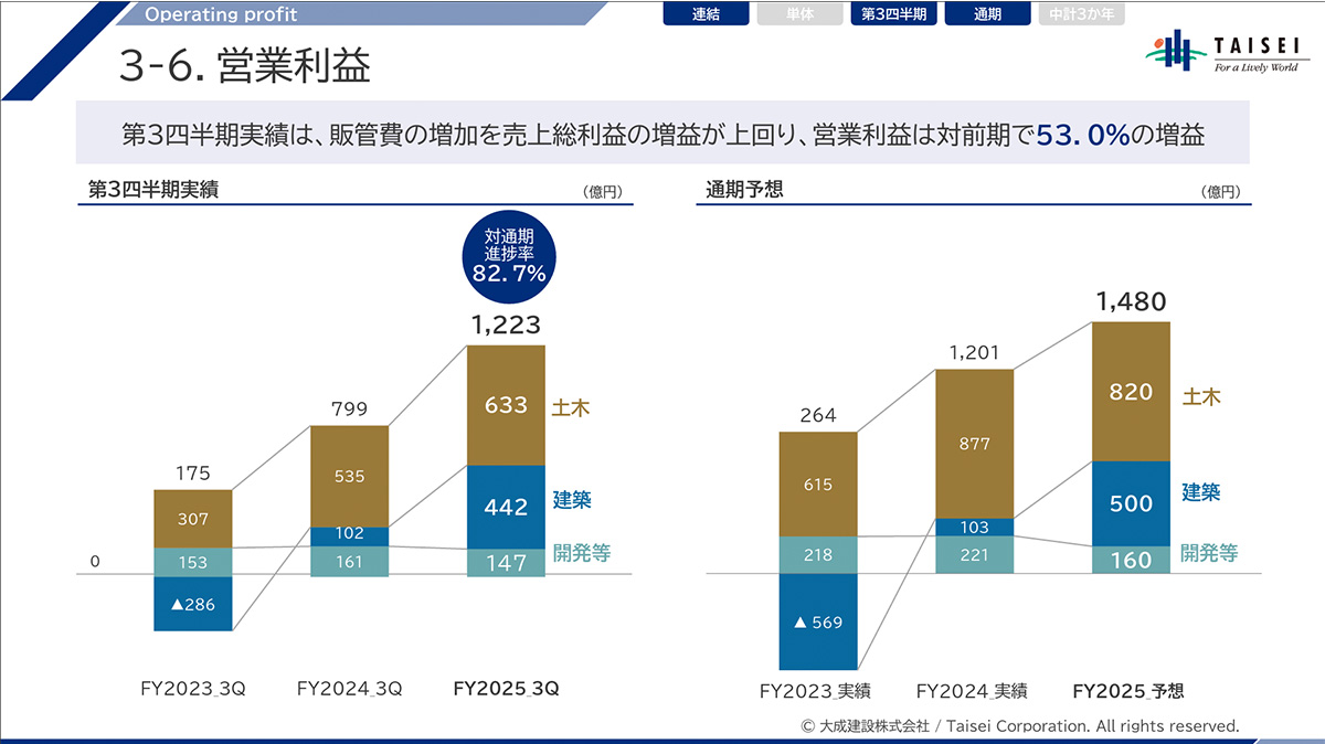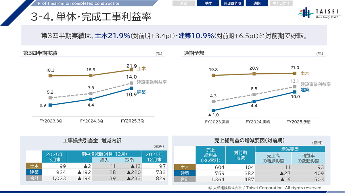 土木事業もさらに収益性が高まり、建築事業は大幅に改善しています。