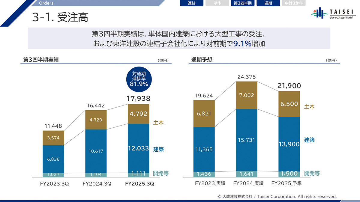 続いて土木事業と建築事業の受注高の詳細な内訳は、以下の通りです(2025年3月期決算説明会 補足資料 P3参照)。