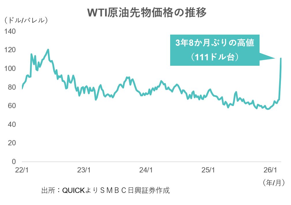 WTIの先物価格が100ドルを超えるのはロシアによるウクライナ侵攻のあとの2022年7月以来、およそ3年8か月ぶりとなります。