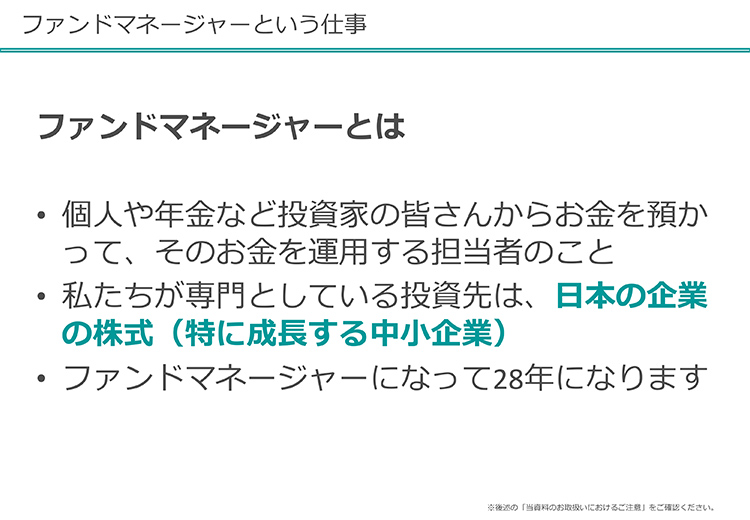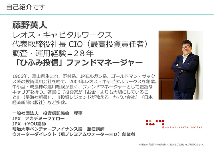 まず、私たちの仕事からご紹介させてください。私はレオス・キャピタルワークスという会社の代表でして、「ひふみ投信」「ひふみプラス」というファンドのファンドマネージャーをしております。1966年富山県に生まれて、その後国内外の会社を経て、2003年にレオス・キャピタルワークスという会社を私自身が立ち上げています。