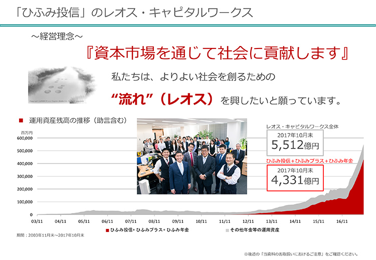 私はファンドマネージャーになって28年になります。経営理念は「資本市場を通じて社会に貢献する」という考え方を持っています。社名の「レオス」についてどういう意味か聞かれますが、ギリシャ語で「流れ」という意味です。今、会社全体でいうと、2017年10月末で5512億円の運用残高になっていますが、昨日の段階だと6100億円というような金額になっています。