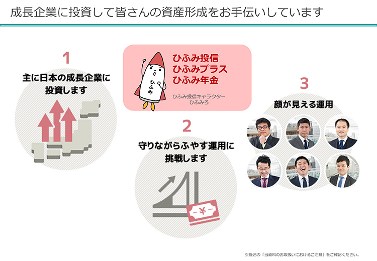 私たちは3つの特色がありまして、「成長企業に投資をする」。それから、「守りながら増やす運用に挑戦する」。あと、「顔が見える運用」というところで、私自身や、運用している残り5名のファンドマネージャー、アナリストがこうやって顔を出して、自分たちの考え方を伝えています。