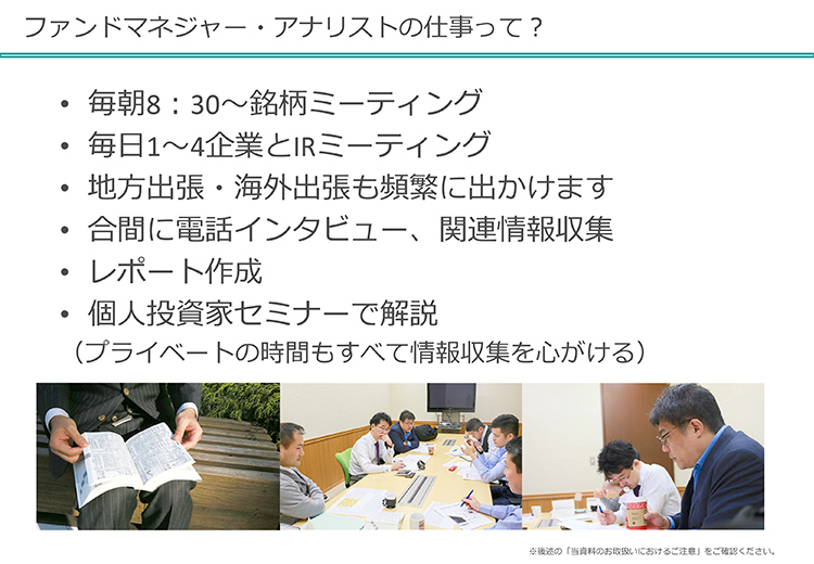 じゃあ、ファンドマネージャーやアナリストってどういうことをしていますか、ということですけれども、毎朝8時半から「銘柄ミーティング」というのをしています。これ、僕らの特色なんですけれども、雑談のように話をするんですよ。「いろんな会社に行ってきました」とかいうことで話すんです。レポートをもって話をすることももちろんあります。でも、昨日は友だちと会ったとか、こういう話をしたとか。遊びに行ったけれども、こういうところで面白かったとか。あと、昨日読んだ新聞でこういうことがあるけれども、私はこのことに対しては賛成だ、反対だ、みたいなことを言って、みんなでワアワア言います。