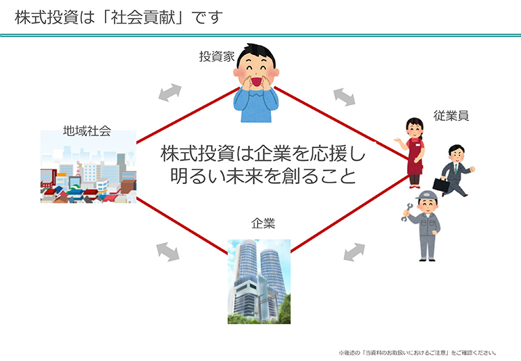 じゃあ、そもそも株式投資はというお話をします。私は株式投資というのは、「未来をつくること。明るい未来を応援すること」だと思っています。これにはいろいろな考え方があります。そうじゃない、そんな甘っちょろいことを言うんじゃない、「頭を使って、勝つか負けるかのゲームだ」という考え方があるのもわかります。別にそれは否定しません。ただ、私たちは「明るい未来をつくる」という前提に立っています。