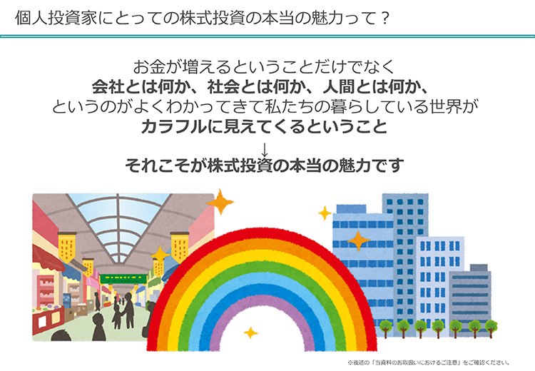 お金が増えるということではなくて、それよりも大事なことは、「会社」とは何か? 「社会」とは何か? 「人間」とは何か? というのがよくわかってきて、「暮らしている世界がカラフルに見える」というのが、株式投資のいいところなんですね。皆さんが株式投資をして、この銘柄、上がるか下がるかというところで、儲かった、損したというのももちろん株式投資の醍醐味です。でも、株式投資を通じて、「より社会を知る」とか、「世の中を知る」とか、「人間を知る」とかいうことになると、より楽しくなると思うんですね。生活そのものが、カラフルに見えると私は思います。いろいろな人がいて、いろいろな考え方があっていいというふうに思えるんじゃないかなと思うんですね。