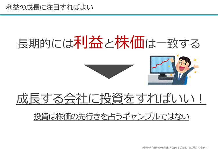 まず1つの前提は「長期的に利益と株価が一致する」ということです。成長する会社に投資をしようということが大事です。これはどういうことかというと、短期的に言うとですね、株価というのはマーケット全体の動きに引っ張られるんです。マーケット全体の動きというのは世の中の気分に引っ張られます。