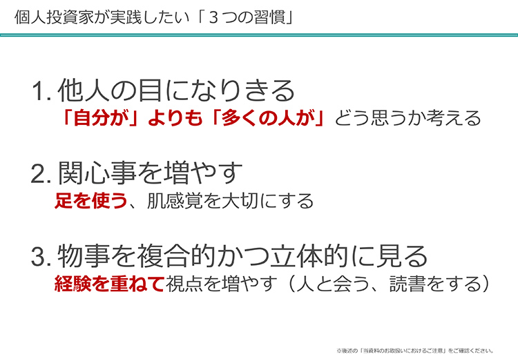 その中で、個人投資家が実践したい3つの習慣について話します。1つは、「他人の目になりきる」。自分よりも多くの人がどう思うか考えるかで見るといいでしょう。それから、関心事を増やす。足を使う。肌感覚を大切にする。それから、物事を複合的かつ立体的に見る習慣があるといいのではないでしょうか。