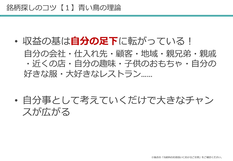 じゃあ、明日からできる会社を見るときのポイントを3つ紹介しましょう。まず、「青い鳥の理論」についてお話をします。収益の元は、自分の足元に転がっていることが多いのです。自分の会社とかね。自分の会社って過小評価しがちなんですよ。何でかというと、全部わかっているから。全部わかっているものってミステリアスじゃないので、過小評価しやすいんですね。でも、自分の会社こそ本当は収益が上がっているか、下がっているかというところを一番見極めることができますから、自社の持株会の変更時期などタイミングが合えば、購入株数を増やすとか減らすとか。だから持株会がある人は、自分の足元にチャンスがあると思ったほうがいいんですね。