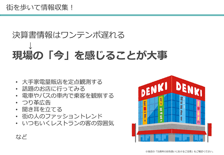 決算書情報はワンテンポ遅れますので、街を歩いて情報収集して現場の「今」を感じることが大事です。私がいつも学生さんにお勧めしていることがあります。それは、「家電量販店を毎月、地下から上まで歩いて、思っていること、感じていることをメモをとる」ということです。ひと月に1回でいいです。1年間やるだけで、消費の「今」がわかりますよ。今、百貨店よりも多くのものが売られているのは家電量販店なんですね。おもちゃも売っているし、それから宝飾品も売っているし、スポーツ用品も売っていますよね。そうすると、消費の「今」を見ることができる一番いい場所が家電量販店ということになります。
