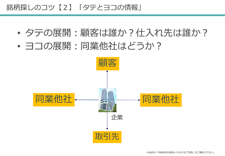 銘柄探しのコツとして、「縦横展開」というのがあります。何かというと、1つの会社を調べるときに、同業他社はどうなっているか、お客様はどうなのか、取引先はどうなのか、というところを考えてみるということですね。すごく大事な習慣ではないかと思います。