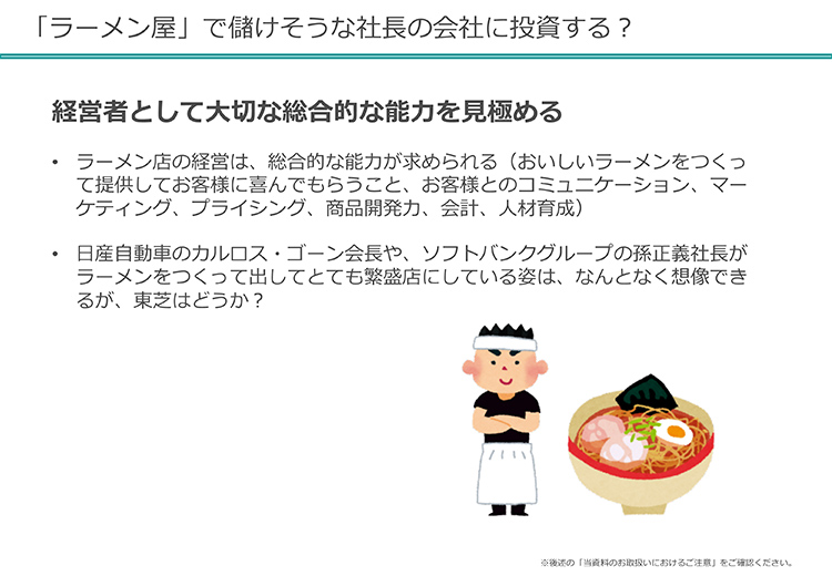 そして、「経営者をチェック」です。私が重要視しているのは、「ラーメン屋で儲けそうな社長の会社に投資する」という視点です。今日、あとでスノーピークの山井社長に来てもらいますけどね。めっちゃラーメン屋さんで成功しそうですよ、あれは(笑)。僕ら、スノーピークにはたくさん投資しているんですけど、意外と大事だったりするんです。「あ、このおじさん、ラーメン屋さんの店長で、エプロンとか着させても、なんか様になるんじゃないかなあ」という視点。昔は大企業のサラリーマンって偉そうで、エリートっぽさが重要だったかもしれません。しかし、これからの社会ではビジネスマンとして、一からビジネスを切り拓いていけるか、という感覚が大事なので。この社長さんが個として立って、ラーメン屋さんの店長だったとしても繁盛店が作れるかというような人に賭けたいなと思っています。