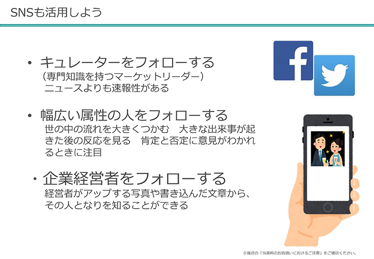 さらに、SNSも活用する。キュレーターをフォローしましょう。投資の世界で有名な人っていろいろいますよね。そういう人をフォローして、その人が見たり、シェアしているものを追っていったり、それでまたフォローしていけば、情報が広がります。SNSは発信することより、見ることが大事です。SNSは怖いなあとか、フェイスブックなどをやると情報が抜き取られるんじゃないかと思う人もいるかもしれませんが、最低の情報だけ入れておいて、とにかく見ることに徹するということだけでも試してください。ほとんど無料で情報を得ることができ、皆さんの世界を広げていくでしょう。