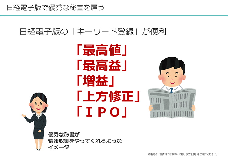 あと、日経電子版。こちらは有料ですが、キーワード登録がすごく便利ですね。私は「最高値」「最高益」「増益」「上方修正」「IPO」という言葉を登録しています。すると記事を切り抜きみたいにしてくれるのが、すごく便利です。わざわざ朝早く起きて、切り抜きをしてくれる秘書さんを雇っているようなものです。毎朝秘書に来てもらって、切り抜きをしてもらう作業を考えてみると、時給がどのくらいかかるかを考えたら、この日経電子版は取る価値があるんですね。そうすると、僕らにとって有益な情報が簡単に赤枠で囲われて、情報を取ることができます。4000円とか5000円とか払ったとしても、情報収集料としてすごく安いと思います。