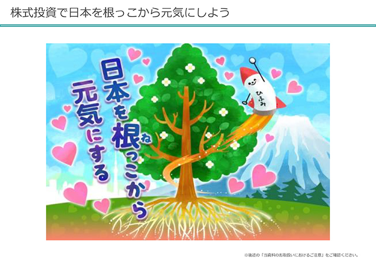 最後に、僕らがやりたいことは日本を根っこから元気にするということです。北海道から沖縄までいろんな会社がありますが、株式投資の良さというのは日本を元気にできることじゃないかなと思います。これからまた、あとでお話しする機会もありますが、ご静聴、どうもありがとうございました。